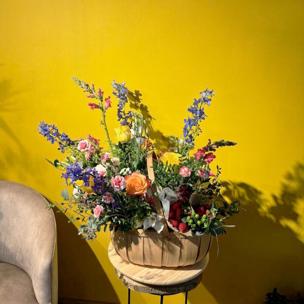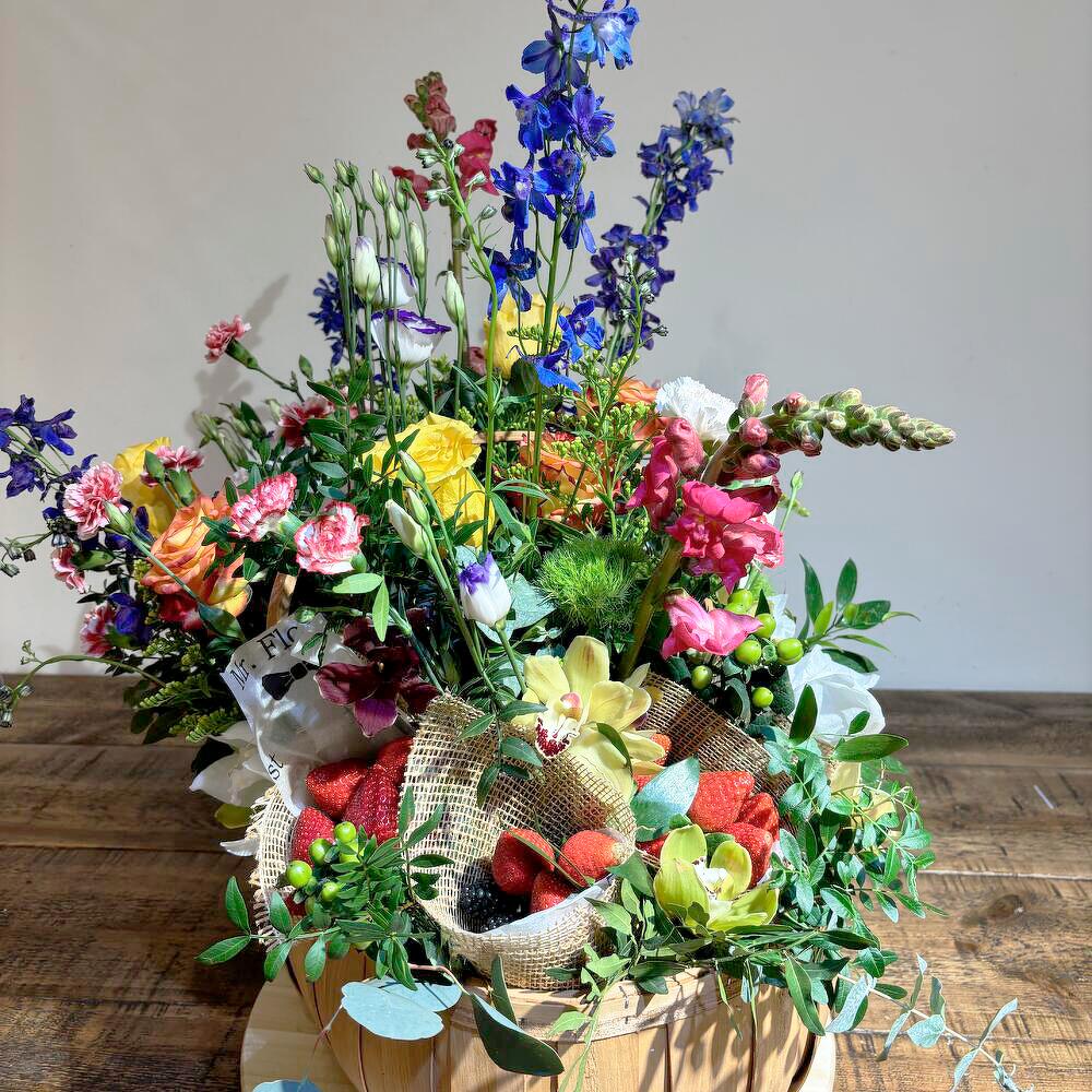 Un arreglo espectacular en canasta de madera que combina flores de colores vibrantes y fresas naturales, creando una experiencia llena de alegría y frescura. Las rosas amarillas y naranjas simbolizan amistad y energía, mientras las flores azules y rosadas aportan un toque de serenidad y romance. Las fresas frescas dan un detalle dulce y original, ideal para sorprender en cumpleaños, aniversarios o como regalo especial. Para su cuidado, rocía las flores con agua fresca cada día y mantén las fresas refrigeradas si no se consumen de inmediato, garantizando su belleza y sabor por más tiempo. Este arreglo es perfecto para quienes buscan un detalle único, natural y delicioso.