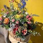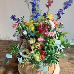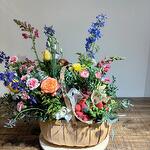 Eucalyptus - 5 ud. Lisianthus - 5 ud. delphinium - 4 ud. antirrhinum - 6 ud. lentisco - 10 ud. cesta de mimbre - 1 ud. fruta de temporada - 5 ud. solodago - 8 ud. rosa jardín variada - 10 ud. clavelinas bicolor - 5 ud. clavelinas bicolor rosa - 5 ud.