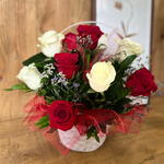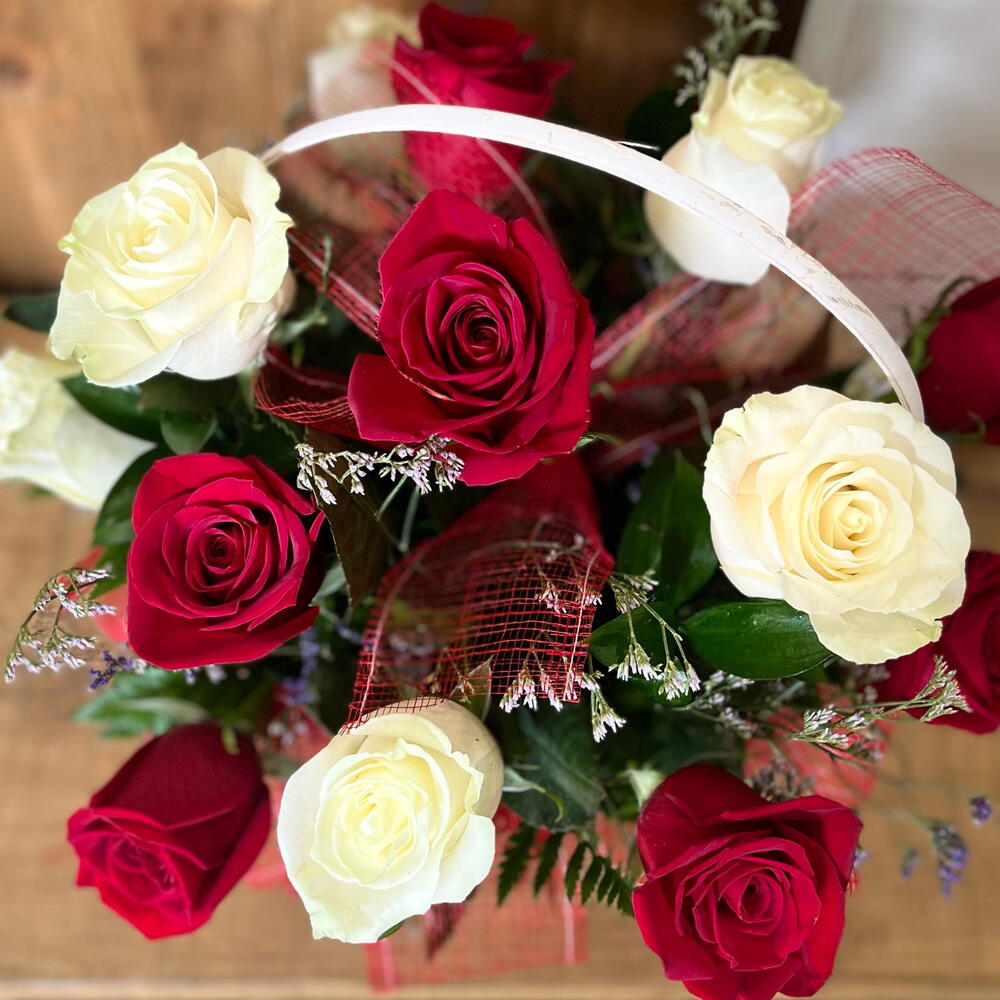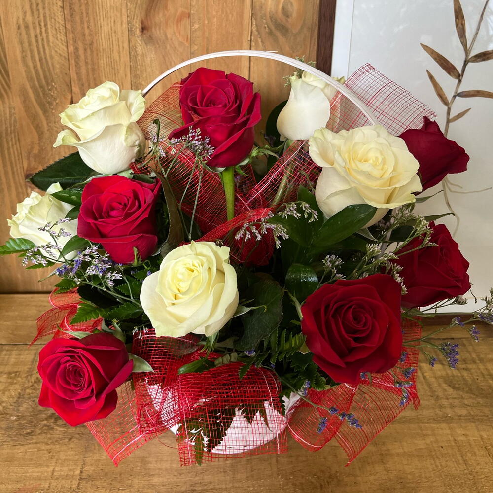 Cesta con rosas rojas y blancas