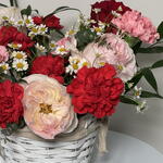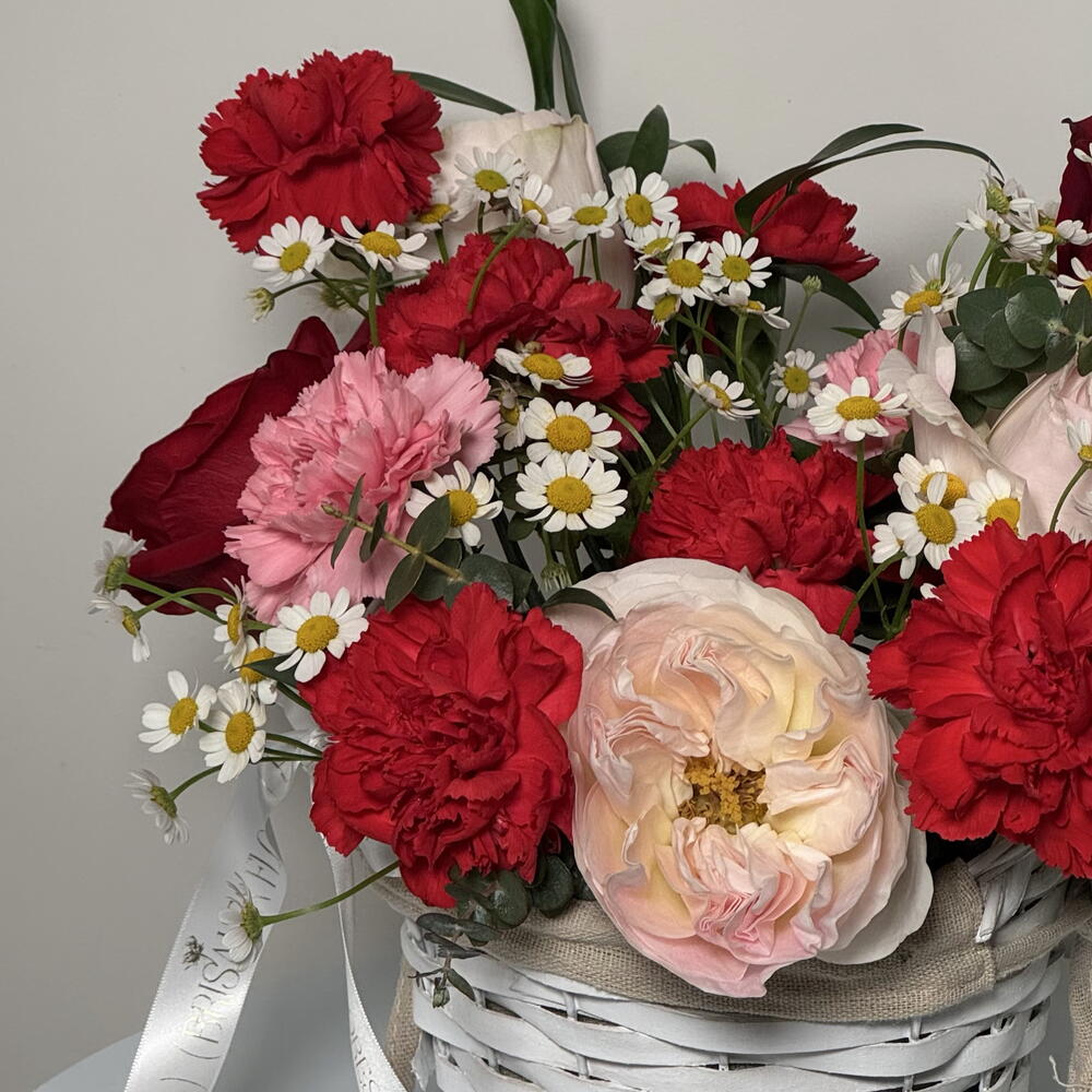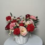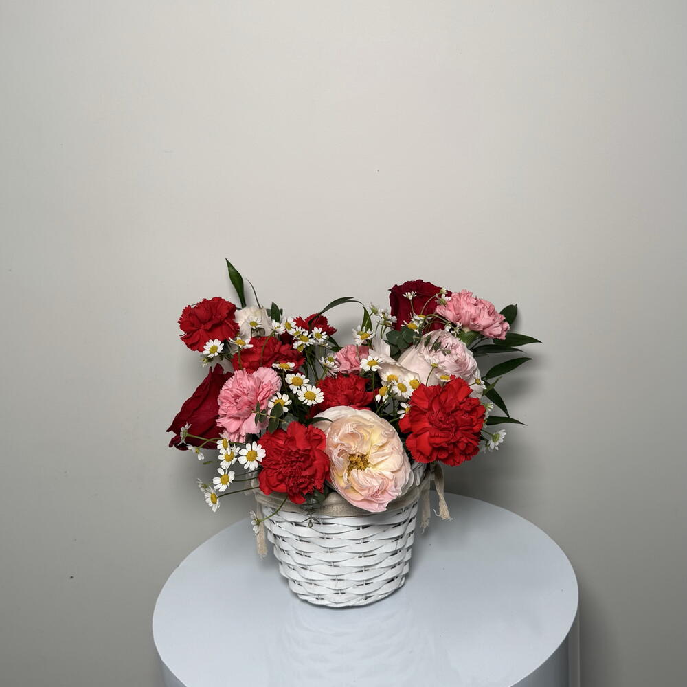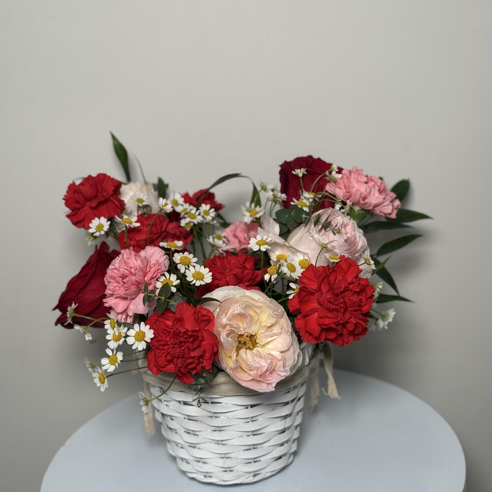 Cesta con rosas y flores primaverales Una delicada y encantadora composición en cesta que combina rosas elegantes en tonos suaves con vibrantes claveles rojos y pequeñas flores silvestres que evocan la frescura de la primavera. Este arreglo transmite alegría, ternura y calidez, convirtiéndose en el regalo perfecto para sorprender y emocionar en cualquier ocasión. Ideal para cumpleaños, agradecimientos o simplemente para regalar una sonrisa 💐✨