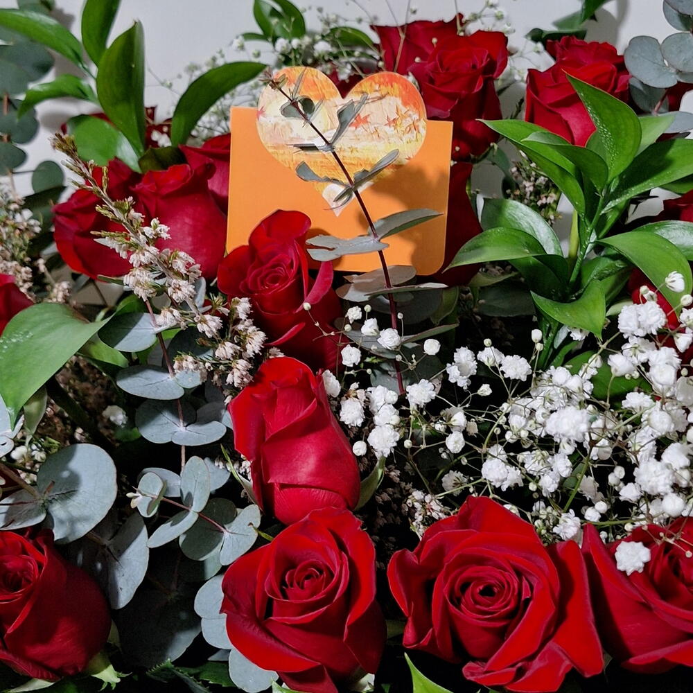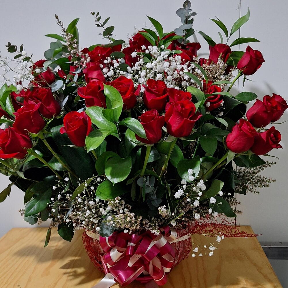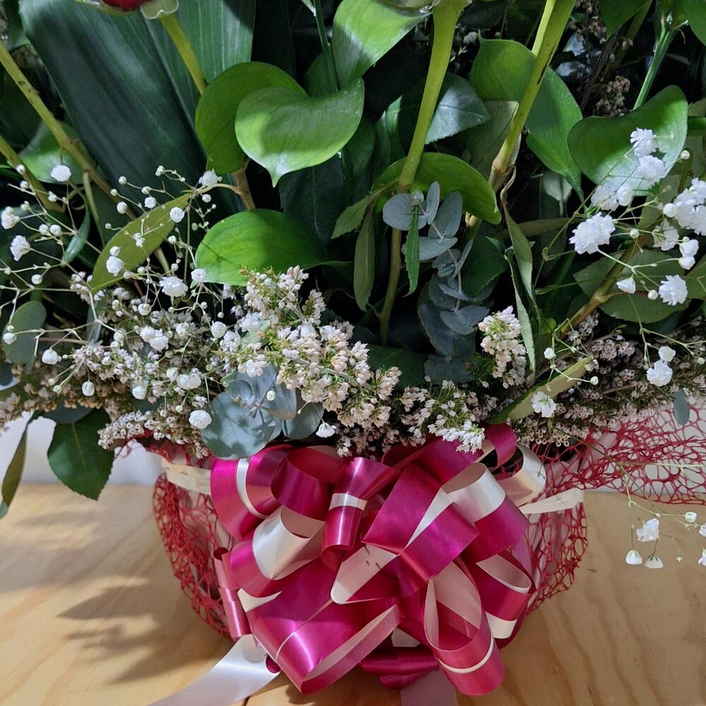 Ruscus - 6 ud. paniculata - 4 ud. aspidistra leaves - 4 ud. eucalyptus leaves - 6 ud. rosas rojas tallo largo - 50 ud. cesta de mimbre - 1 ud. lazo de cinta - 1 ud.