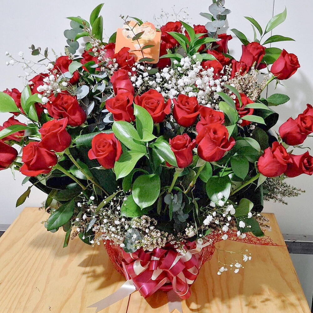 Nuestra cesta de rosas rojas es la selección perfecta para cualquier ocasión. Compuesta por una elegante canasta de mimbre, cuenta con 50 rosas rojas de tallo largo que simbolizan el amor y la pasión. Además, incorpora paniculata, aportando un toque de encanto y delicadeza. Cuenta también con hojas eucalipto que añaden frescura y color, un lazo de cinta que envuelve la canasta con elegancia y hojas de ruscus que le dan el contraste perfecto al diseño. Por último, incluye hojas de aspidistra que aportan textura al arreglo. Esta cesta de 50 rosas rojas es sin duda una composición floral que encantará a la persona que tanto quieres.