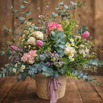 Cesta silvestre para regalar Un detalle elegante y natural, pensado para sorprender sin resultar excesivo. La composición combina flor fresca de temporada y verdes ligeros, creando un conjunto luminoso y equilibrado que encaja en cualquier espacio. Cada cesta se realiza a mano en el momento del pedido, por lo que siempre es única, pero mantiene la misma estética: delicada, actual y atemporal. Un regalo que no solo se entrega, se disfruta durante días.