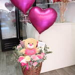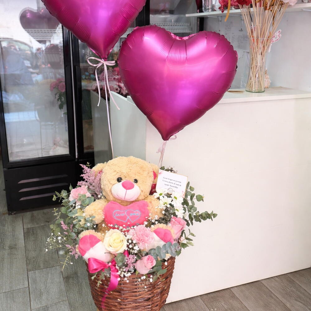 eucalipto - 10 ud. rosas - 5 ud. clavel - 1 ud. cesta de mimbre - 1 ud. peluche 35cm - 1 ud. globos con helio - 2 ud. solidago rosa - 5 ud.