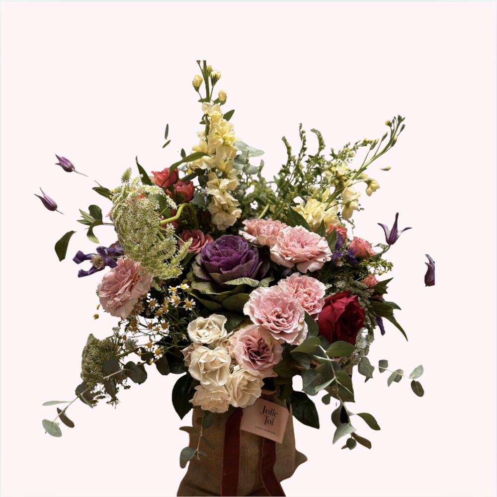 ammi - 2 ud. claveles - 6 ud. antirino - 3 ud. manzanilla - 1 ud. aucalipto - 1 ud. col ornamental - 1 ud. rosas pitinimi premium blancas - 1 ud. rosas pitinimi premium rosadas - 1 ud. rosa roja de jardin - 1 ud.
