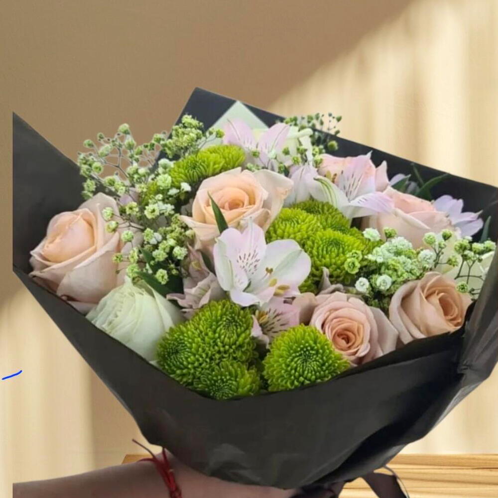 Este elegante ramo combina la suavidad de las rosas en tono durazno con la frescura vibrante de los crisantemos verdes, creando una armonía visual delicada y moderna. Acompañado de alstroemerias rosadas y gypsophilas blancas, transmite ternura, serenidad y frescura natural. Su envoltura en papel negro añade un contraste sofisticado que realza los colores suaves del bouquet. Ideal para regalar en cumpleaños, aniversarios, agradecimientos o simplemente para alegrar el día de alguien especial. Cada flor ha sido cuidadosamente seleccionada para garantizar su belleza y frescura. Este ramo es una expresión sutil de elegancia y cariño. ¡Un detalle perfecto para sorprender con estilo y dulzura!