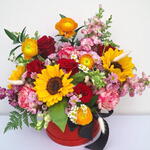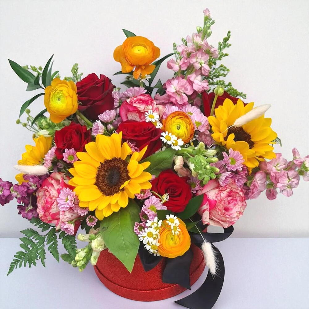 “Círculo de Luz y Amor” es un arreglo floral radiante que combina la calidez de los girasoles, la pasión de las rosas rojas y la dulzura de las flores rosadas en una armonía perfecta. Presentado en una elegante caja redonda de color rojo brillante con moño negro, este diseño moderno y vibrante transmite energía, alegría y elegancia. Ideal para cumpleaños, agradecimientos o para sorprender a alguien especial con un gesto lleno de vida. Cada flor ha sido seleccionada por su frescura y belleza, asegurando una presentación impactante desde cualquier ángulo. Un detalle inolvidable que despierta emociones y transforma espacios. Regalar este arreglo es regalar felicidad.