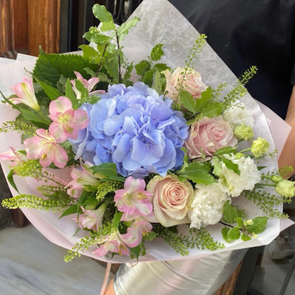 Este producto pertenece a la categoría De autor, conformado por una elegante mezcla de flores. Una hermosa hortensia es la pieza principal, complementada con tres rosas de color rosa que agregan un toque suave y delicado. Dos lisianthus se suman al arreglo, aportando su belleza distintiva, mientras que tres alstermerias dan un aire de exotismo. El conjunto se redondea con tres talaspi, para un agradable toque de verdor. Este ramo es la creación perfecta para cualquier ocasión.