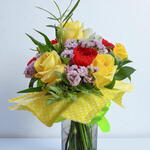 Este elegante arreglo floral de autor consta de 3 siempre vivas, añadiendo un toque eterno al diseño. Complementado con 5 radiantes rosas y 3 frescas astromeruas que realzan su sofisticación. Adicionalmente, lleva 3 claveles para un equilibrio perfecto y armonioso. El conjunto es adornado con un lazo, dando un guiño a la tradición y la elegancia. Finalmente, todas estas bellezas vienen dentro de un florero, aumentando la gracia y el atractivo del conjunto floral. Perfecto para decorar cualquier espacio con un estilo delicado y refinado.
