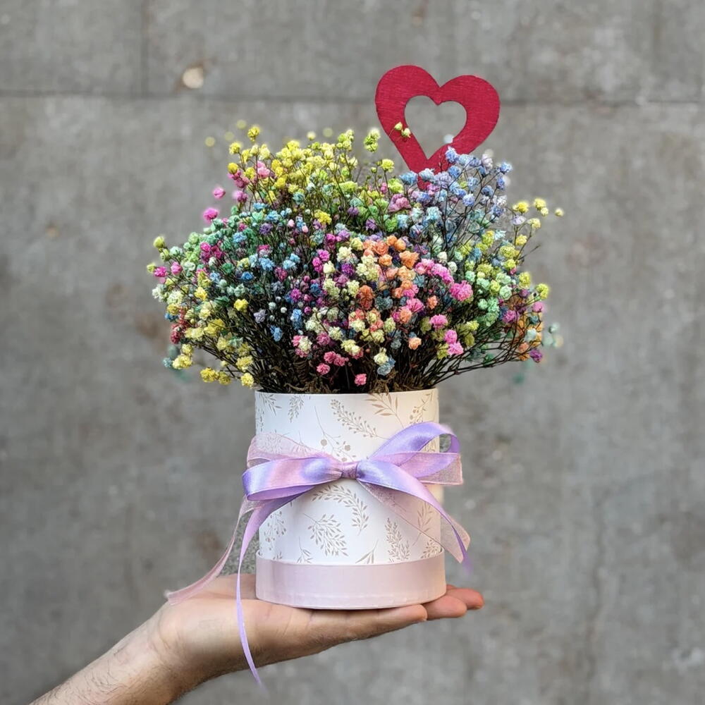 Colorful Love es una composición floral llena de vida, creada con paniculata multicolor y presentada en una caja cuidada, rematada con un detalle en forma de corazón que aporta intención y emoción al conjunto.