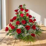 Esta elegante composición funeraria destaca por la intensidad y belleza de sus rosas rojas, símbolo profundo de amor y recuerdo eterno. Su diseño en forma piramidal aporta equilibrio y solemnidad, creando una presencia digna y respetuosa. Las delicadas flores blancas añaden pureza y ligereza, suavizando el conjunto con armonía. El follaje verde envuelve la composición, aportando frescura y un toque natural. Cada elemento ha sido cuidadosamente dispuesto para transmitir consuelo y respeto. Es una elección ideal para expresar sentimientos sinceros en un momento de despedida. Un tributo floral que honra la memoria con fuerza y sensibilidad.