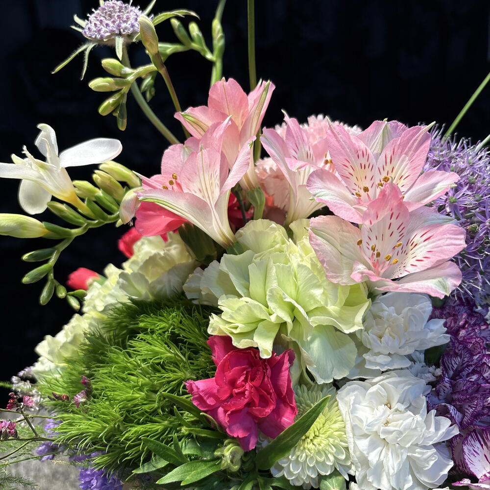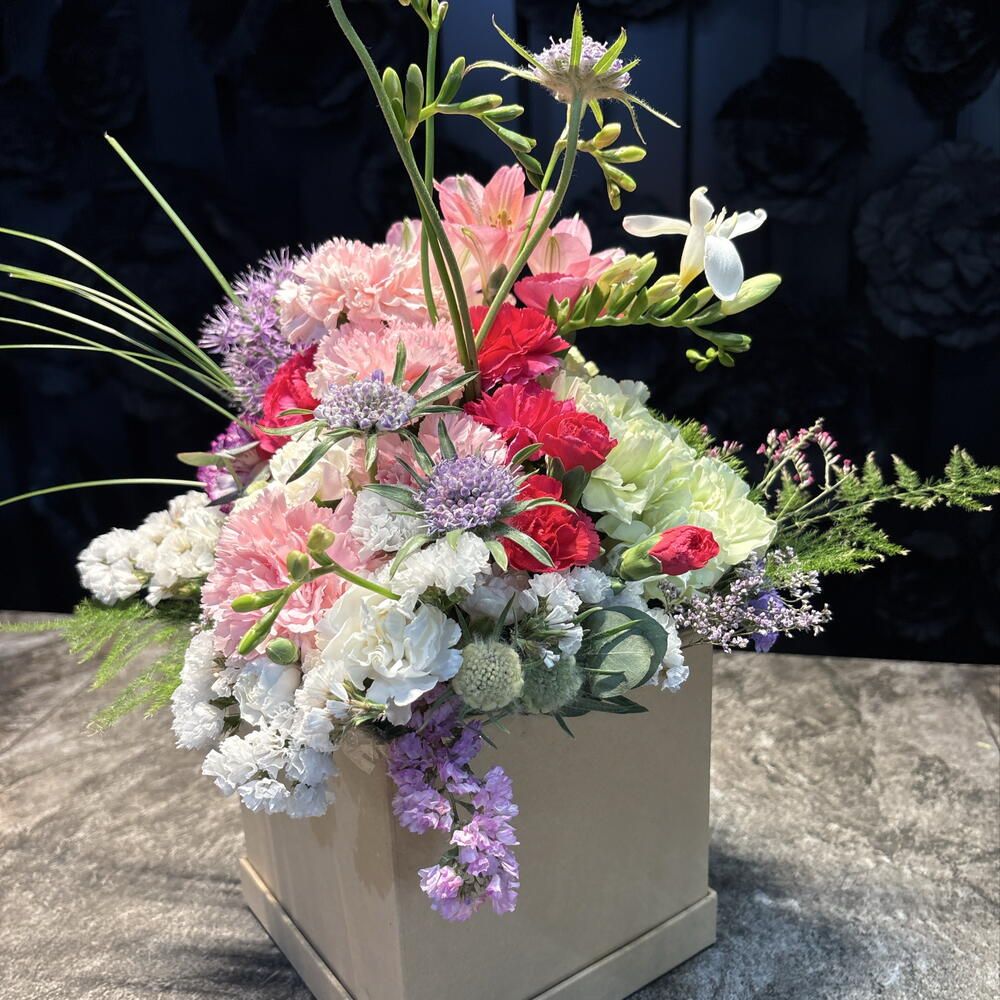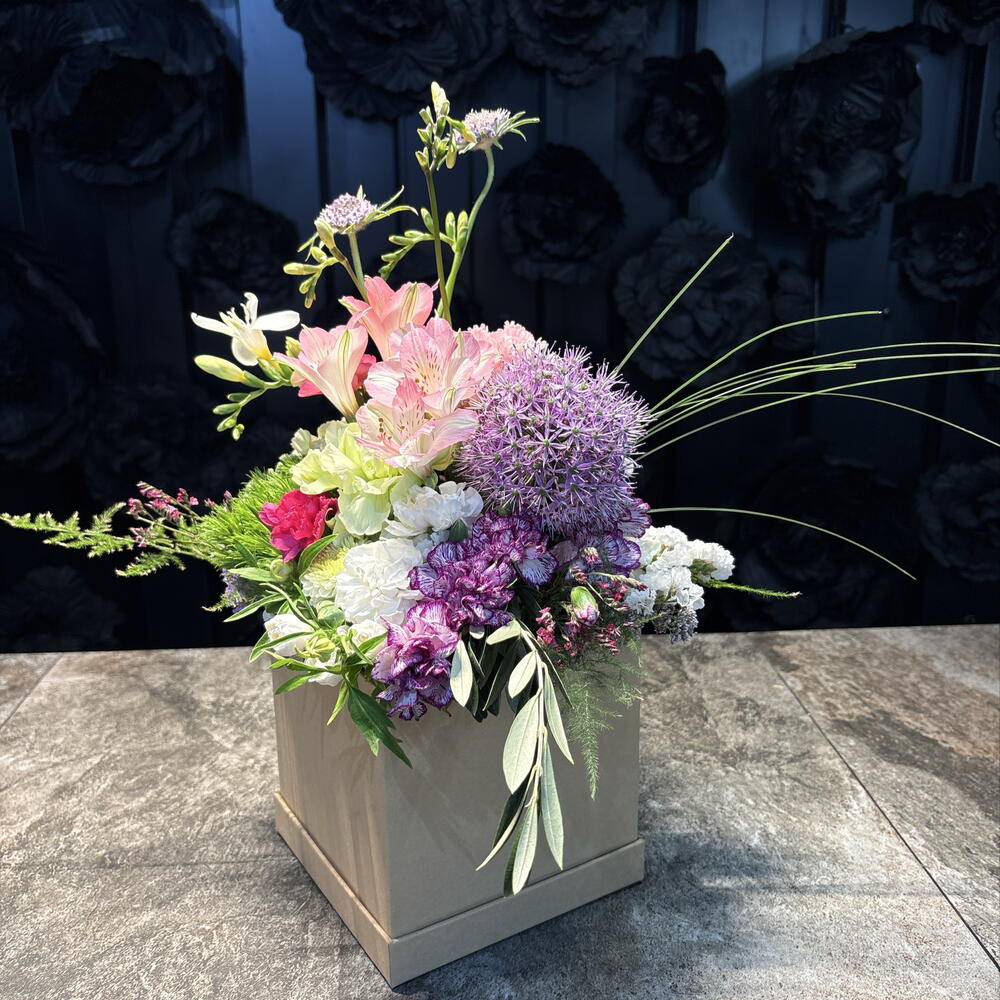 Alstroemeria - 1 ud. dianthus - 1 ud. asparagus - 1 ud. scabiosa - 5 ud. fresia - 1 ud. allium - 1 ud. clavel - 10 ud. vbox caja de papel - 1 ud.