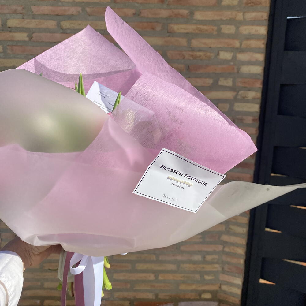 Una combinación armoniosa y delicada, diseñada para iluminar cualquier espacio y sacar una sonrisa inolvidable. Este ramo artesanal está compuesto por: • 20 Tulipanes Premium. • Paniculata: Aporta ligereza, volumen y ese toque romántico clásico. • Eucalipto Fresco: Ramas seleccionadas que añaden una fragancia natural relajante. • Envoltorio de Diseño: Papel decorativo en tono rosa suave que realza la estética coquette.