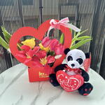 tulipanes - 3 ud. astromelias - 3 ud. caja corazón - 1 ud. oso peluche 20 cm - 1 ud.