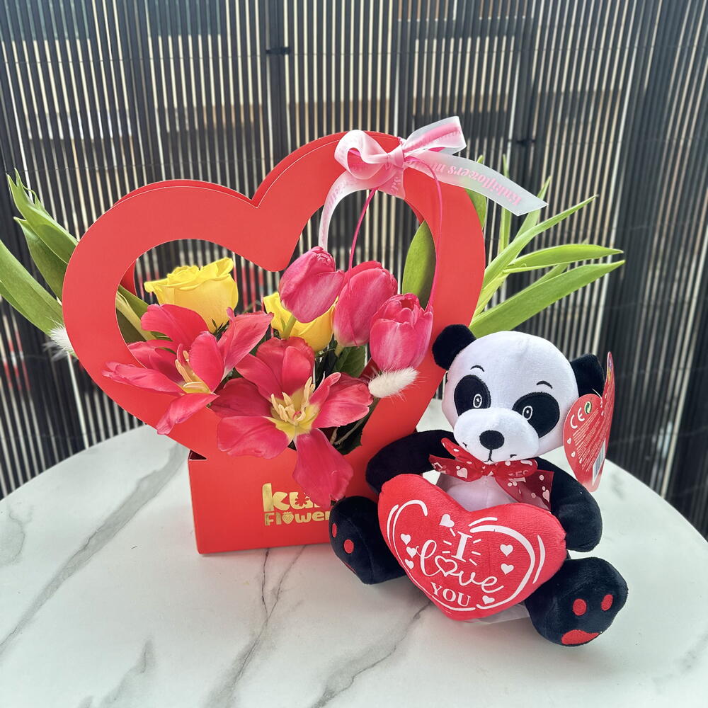 tulipanes - 3 ud. astromelias - 3 ud. caja corazón - 1 ud. oso peluche 20 cm - 1 ud.