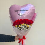 Hermoso bouquet romántico ideal para cumpleaños, aniversarios o sorprender a alguien especial. Incluye un globo metálico en forma de corazón personalizado, rosas rojas naturales, chocolates Ferrero Rocher y delicados detalles florales, envuelto con papel premium y lazo decorativo. Un detalle elegante que transmite amor y dulzura. La composición del chocolate es Chocolate con LECHE 30% (azúcar, manteca de cacao, pasta de cacao, LECHE desnatada en polvo, MANTEQUILLA concentrada, emulgentes: lecitinas (SOJA), vainillina), AVELLANAS (28,5%), azúcar, manteca de palma, harina de TRIGO, suero LÁCTEO en polvo, cacao desgrasado, emulgentes: lecitinas (SOJA), gasificantes (carbonato ...