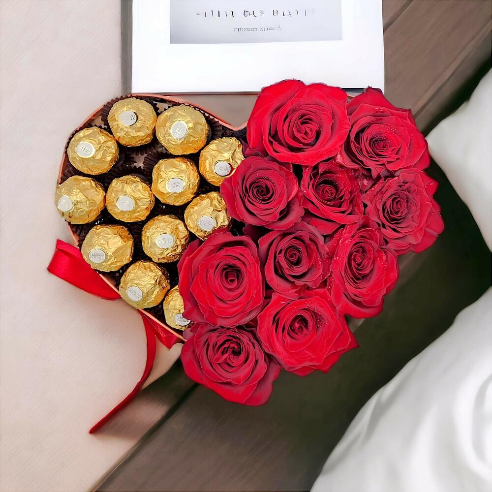 rosas rojas - 10 ud. caja corazón - 1 ud. bombones ferrero - 12 ud.