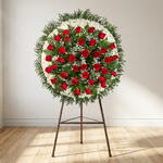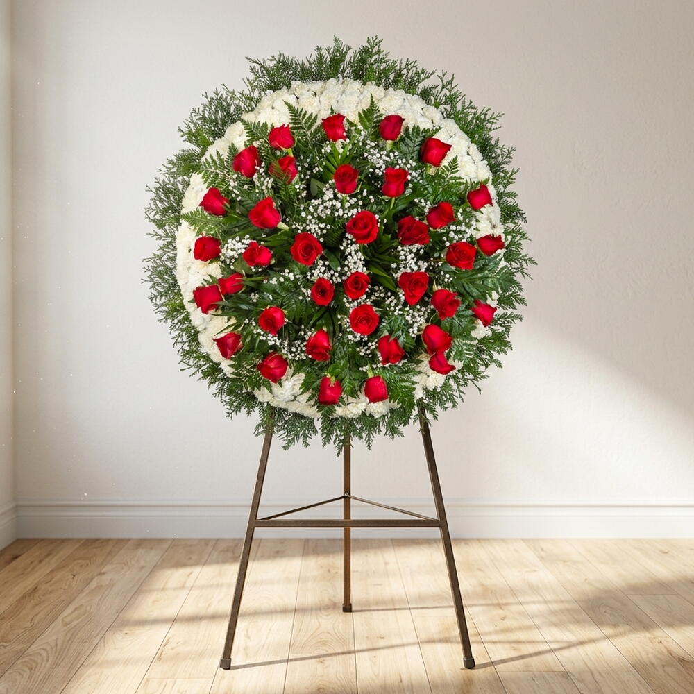 Esta hermosa corona funeraria destaca por la intensidad de sus rosas rojas, símbolo del amor eterno y el respeto profundo. La base de flores blancas aporta serenidad y pureza, creando un contraste elegante y lleno de significado. Cada detalle está cuidadosamente dispuesto para transmitir consuelo y acompañar en el momento de despedida. Las delicadas flores complementarias añaden ligereza y armonía a la composición. El follaje verde enmarca el conjunto, aportando frescura y equilibrio natural. Es una elección ideal para expresar sentimientos sinceros y rendir un homenaje lleno de dignidad. Un tributo floral que honra la memoria con belleza y emoción.