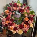 rosa rojas - 20 ud. lilium oriental rosado - 6 ud. rosas melocotón - 6 ud. rosa ámbar - 15 ud. claveles blancos/rojo - 30 ud.