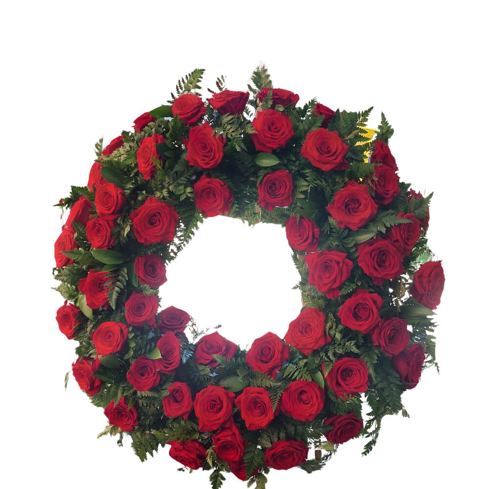 rosa roja - 50 ud. helecho cuero - 20 ud. aro 60 cm - 1 ud.