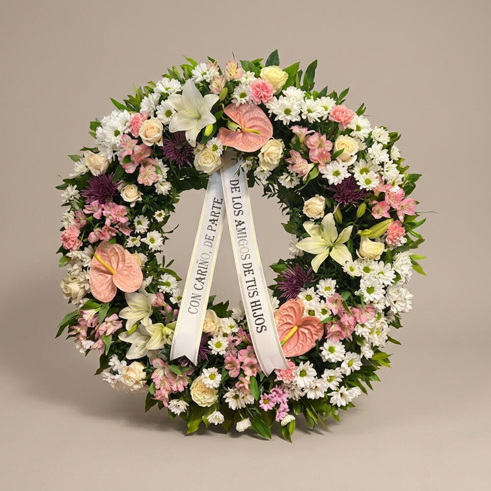 Corona fúnebre elegante y solemne elaborada con una base abundante de crisantemos blancos, acompañados de rosas y claveles en tonos rosados, que aportan delicadeza y respeto. Los lirios blancos simbolizan pureza y paz, mientras que los anthurium añaden un toque distintivo y moderno a la composición. La estructura circular representa eternidad y recuerdo, convirtiéndola en una opción ideal como arreglo floral para condolencias, flores para ocasión especial o despedidas significativas. La cinta central aporta un mensaje personalizado, reforzando el carácter emocional del conjunto. Este ramo elegante y equilibrado transmite serenidad, siendo una elección apropiada como arreglo floral solemne, flores para homenaje o composición floral de respeto, destacando por su armonía cromática y presencia imponente.
