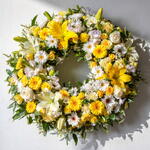 Corona Funebre Despedida Serena – Arreglo Floral Elegante en Tonos Blancos y Amarillos