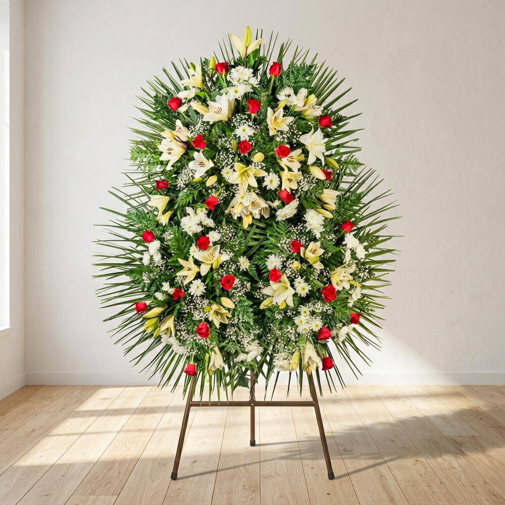 Esta refinada corona funeraria combina armoniosamente tonos blancos, crema y rojos, creando una expresión de amor, respeto y memoria eterna. Los lirios aportan elegancia y serenidad, simbolizando la pureza y la paz del alma. Las pequeñas rosas rojas añaden un toque de amor profundo y gratitud, destacando sobre el verde intenso del follaje. La composición está cuidadosamente equilibrada para transmitir calma y dignidad en un momento de despedida. Los detalles de flores blancas refuerzan la sensación de luz y esperanza. Es una elección ideal para rendir homenaje con delicadeza y sensibilidad. Un tributo floral que acompaña con respeto y belleza en los momentos más difíciles.