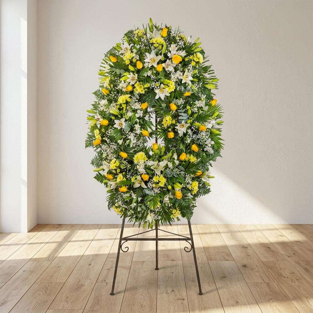Esta delicada corona funeraria destaca por su armoniosa combinación de tonos blancos y amarillos, símbolo de luz, paz y recuerdo eterno. Su diseño transmite serenidad y calidez, ofreciendo consuelo en momentos difíciles. Los lirios blancos aportan elegancia y pureza, mientras que los acentos amarillos representan la esperanza y la gratitud. La composición equilibrada crea una sensación de calma y dignidad en la despedida. El abundante follaje verde enmarca el arreglo, aportando frescura y naturalidad. Es una opción ideal para rendir homenaje con sensibilidad y respeto. Un tributo floral que transmite paz y un recuerdo lleno de luz.