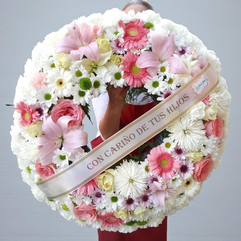 Este exquisito arreglo floral de la categoría de Floristería Funeraria se compone de una hermosa selección de flores y aditivos. Destacan 5 lirios orientales de color rosa, que combinan perfectamente con 8 gerberas rosas y 6 gerberas blancas, aportando un equilibrio de color impresionante. 25 crisantemos blancos variados crean una base de florecillas blancas, intensificada con 12 rosas de colores blanco y rosa, agregando elegancia y gracia al conjunto. El arreglo se completa con 3 unidades de verdes decorativos, que contrastan con las flores, realzando su belleza. Finalmente, una cinta con dedicatoria personalizada proporciona un toque de individualidad y heartfeltedness a esta magnífica obra de arte floral. Este arreglo es la elección perfecta para honrar a tus seres queridos con respeto y amor.