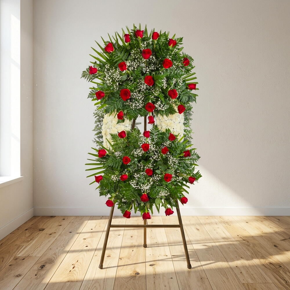 Esta elegante corona funeraria combina la intensidad de las rosas rojas con la pureza de las flores blancas, creando un homenaje lleno de respeto y significado. Su diseño vertical aporta presencia y solemnidad, ideal para una despedida digna. Las rosas rojas simbolizan el amor eterno, mientras que los tonos blancos transmiten paz y serenidad. La delicada gypsophila añade ligereza y suavidad a la composición. El follaje verde envuelve el arreglo, aportando equilibrio y frescura natural. Cada detalle está cuidadosamente dispuesto para expresar sentimientos sinceros. Un tributo floral que acompaña con elegancia y consuelo en los momentos más difíciles.