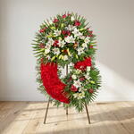 Este elegante corona funeraria transmite respeto, amor y recuerdo eterno en cada uno de sus detalles. Su diseño combina la intensidad del rojo con la pureza del blanco, simbolizando el cariño profundo y la paz del alma. La composición armoniosa de flores frescas crea una presencia solemne y digna, ideal para rendir homenaje a un ser querido. Los lirios blancos aportan serenidad, mientras que los tonos rojos expresan amor y gratitud infinita. El follaje verde enmarca la pieza con equilibrio y naturalidad, realzando su belleza clásica. Es una elección perfecta para despedidas respetuosas y llenas de significado. Un tributo floral que acompaña en momentos difíciles con sensibilidad y elegancia.