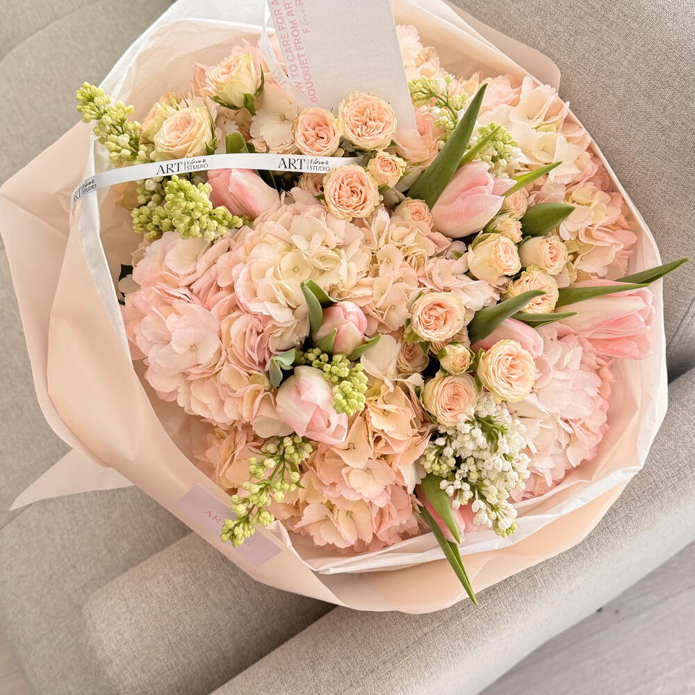 Tulips - 6 ud. Spray rose - 4 ud. Lila - 4 ud.