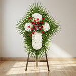 Esta elegante corona en forma de cruz representa un símbolo profundo de fe, recuerdo y despedida sincera. La pureza de las flores blancas transmite paz y descanso eterno, mientras que los delicados acentos en rojo simbolizan el amor que perdura más allá del tiempo. Su diseño armonioso combina tradición y solemnidad, creando un homenaje lleno de significado. El follaje verde enmarca la cruz con fuerza y naturalidad, aportando equilibrio y serenidad. Cada detalle ha sido cuidadosamente dispuesto para reflejar respeto y sensibilidad. Es una elección ideal para despedidas cargadas de fe y emoción. Un tributo floral que honra la memoria con dignidad y esperanza.