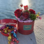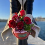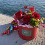 rosas rojas - 3 ud. Gerbera roja - 1 ud. flor de relleno - 1 ud. tulipan rojo - 1 ud. caja sombrerera roja - 1 ud. crisantemo margarita decorativa rosada - 1 ud. clavel verde dianthus verde - 1 ud. eucalipto verde decorativo - 3 ud. pick decorativo corazón - 1 ud. papel decorativo interior - 1 ud.