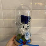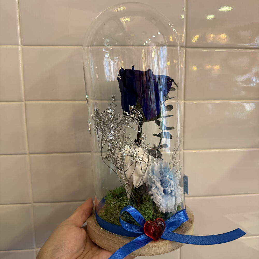 claveles - 1 ud. rosa preservada azul - 1 ud. rosa preservada blanca - 1 ud. cúpula de cristal transparente - 1 ud. elementos decorativos - 2 ud. verdes varios preservados - 2 ud.