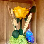 Este exquisito arreglo de flores preservadas viene compuesto por una hermosa rosa amarilla, cuidadosamente preservada para mantener su belleza y frescura a lo largo del tiempo. Está bellamente presentada dentro de una cúpula de cristal, añadiendo así un toque de elegancia y sofisticificación. Para un encanto extra, se incluye también una mariposa artificial que añade un acento lúdico y mágico a la pieza. Este arreglo es perfecto como regalo o como pieza decorativa para cualquier rincón de su hogar.