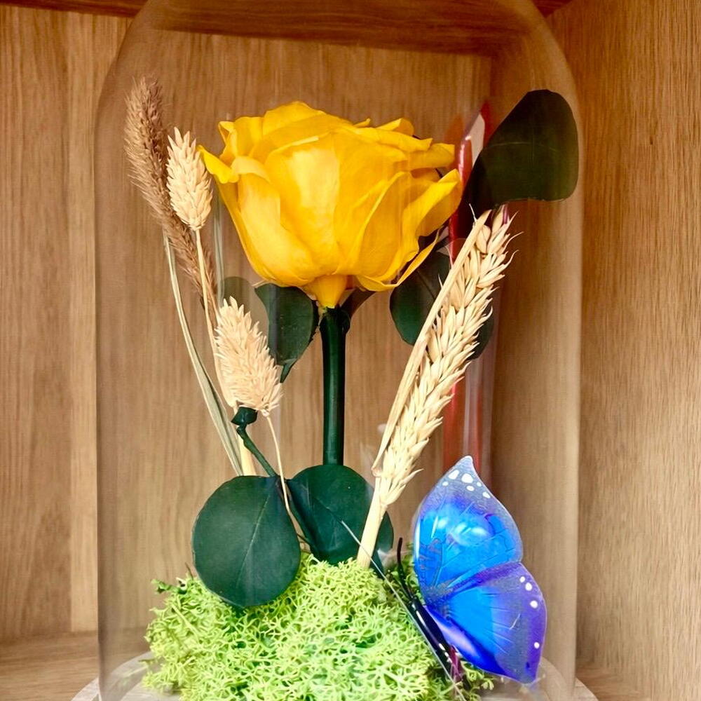 cupula de cristal - 1 ud. rosa preservada amarilla - 1 ud. mariposa artificial - 1 ud.