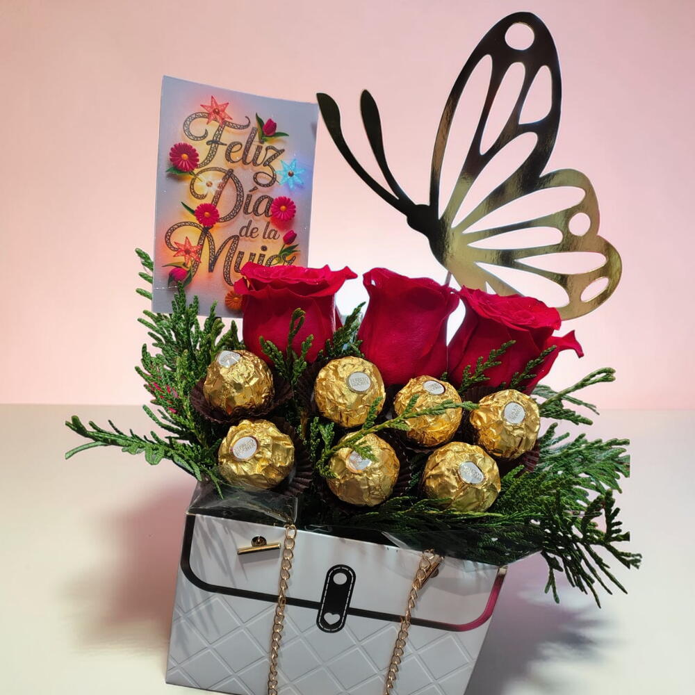 Esta cesta de flores es la mezcla perfecta de belleza y dulzura. Incluye una caja decorativa de color, cuyo tono varía según la disponibilidad. La caja contiene una fina selección de flores y adornos: una unidad de mosi, una de follaje decorativo y tres delicadas rosas rojas. Además, para hacerlo más especial, se han añadido siete unidades de Ferrero Rocher para un toque dulce y una mariposa decorativa. Para finalizar, la cesta viene con una tarjeta de dedicatoria, para añadir sus propias palabras de amor o amistad. Es el regalo perfecto para cualquier ocasión.