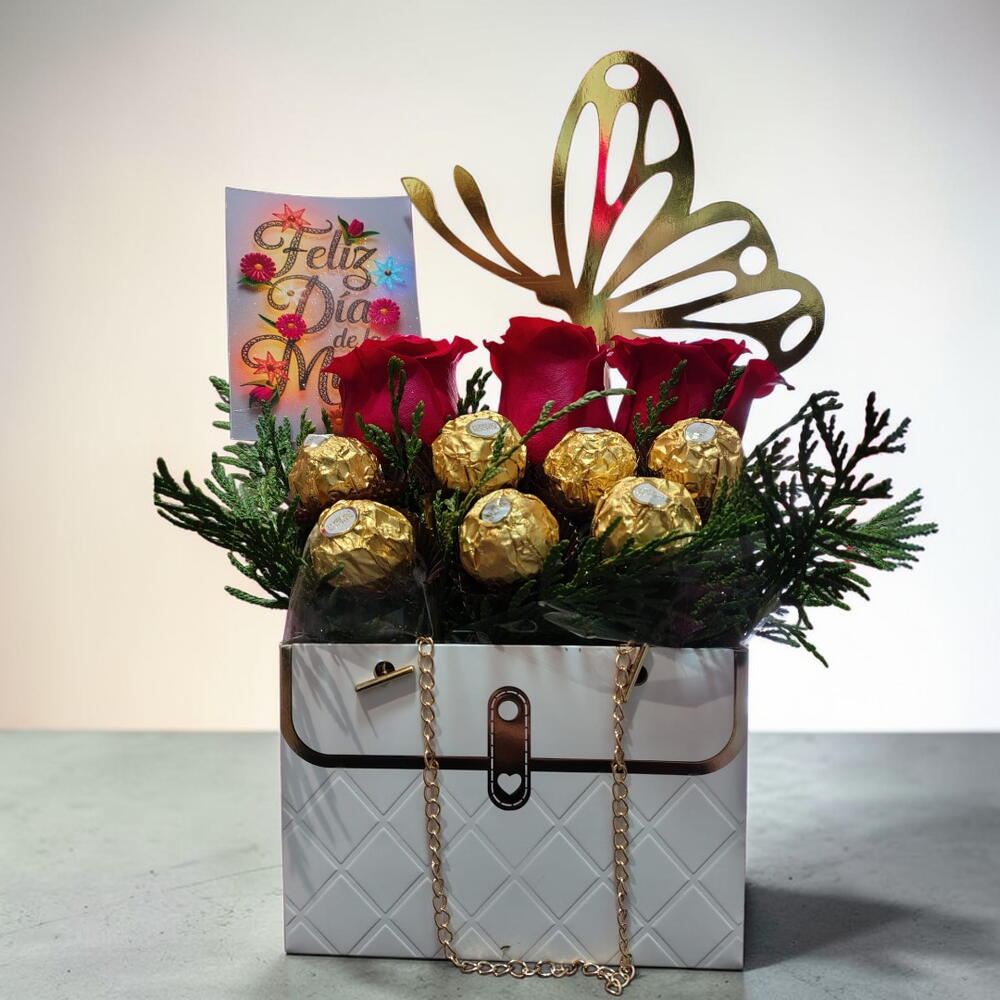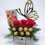 Ferrero rocher - 7 ud. rosas rojas - 3 ud. tarjeta dedicatoria - 1 ud. mosi - 1 ud. mariposas decorativas - 1 ud. follaje decorativo - 1 ud. caja decorativa color según disponibilidad - 1 ud.