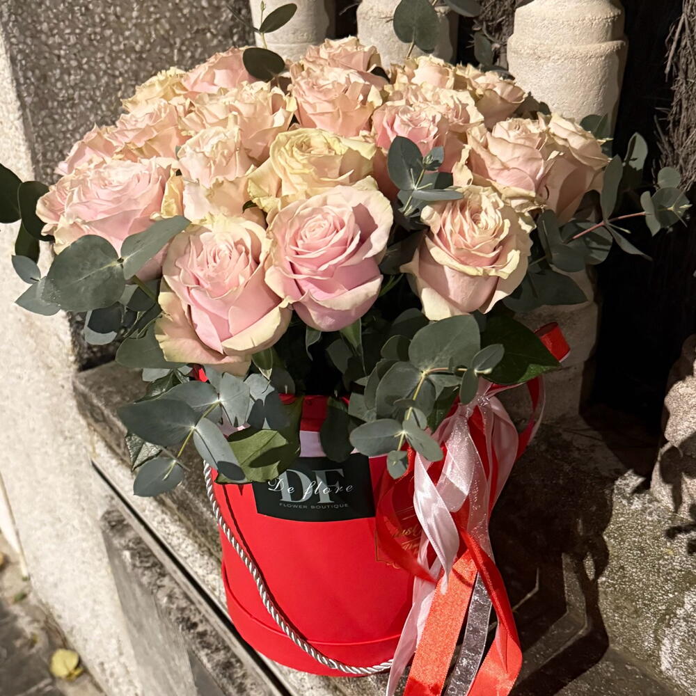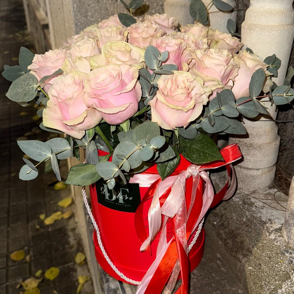 Eucalyptus - 10 ud. box hat - 1 ud. esponja floral - 2 ud. roses - 25 ud. pac - 1 ud.