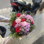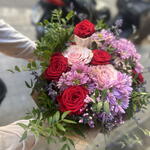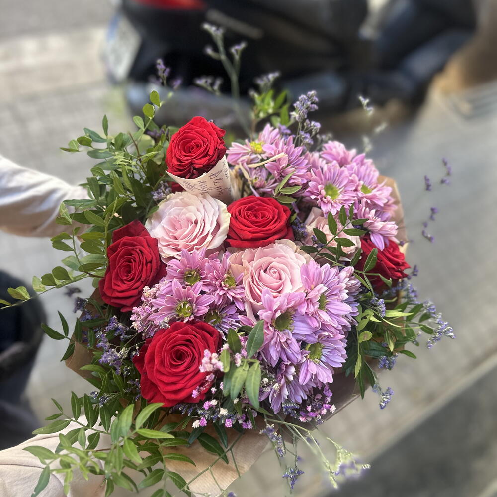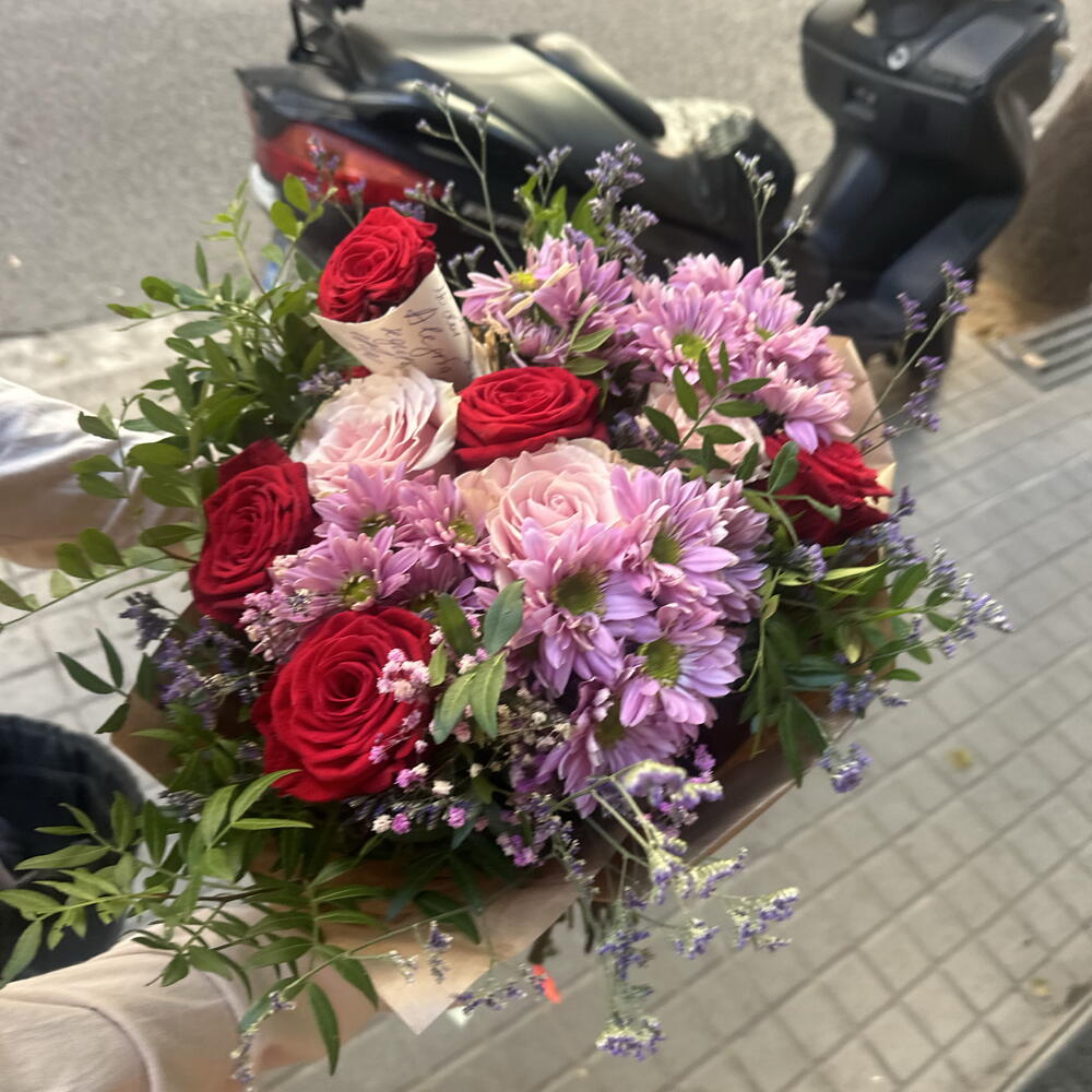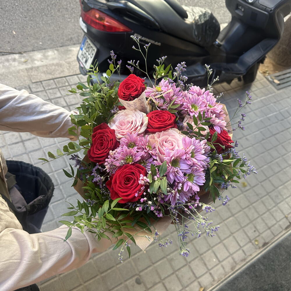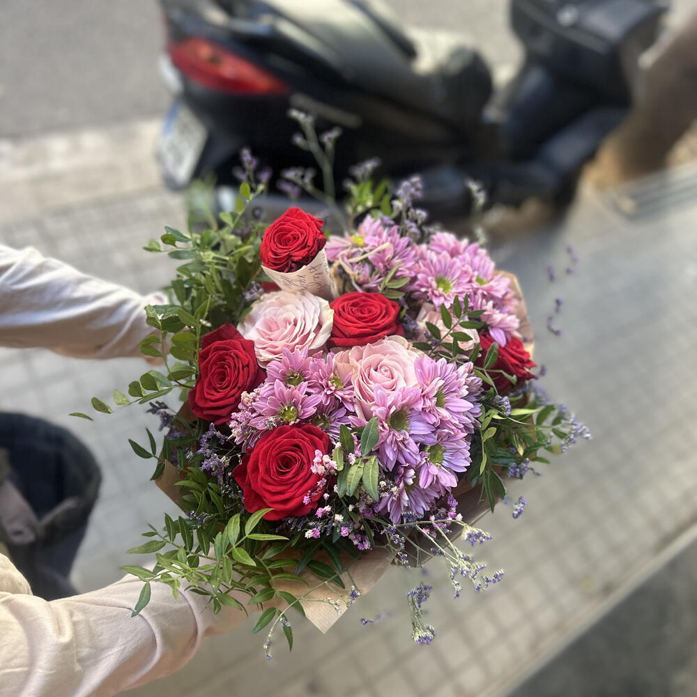 Un elegante arreglo floral que combina la intensidad de las rosas rojas con la suavidad de las rosas rosadas y la frescura de lentisco joven y tonalidades frías : como en bosque, sol y sombra se abrazan en esta combinación. Acompañado de follaje verde y delicadas flores silvestres, este ramo transmite armonía, color y frescura natural. Entre sus flores se entrelazan ramas verdes y pequeñas flores silvestres moradas que aportan ligereza y movimiento, creando un conjunto lleno de armonía y romanticismo rústico. Su contraste de colores intensos y suaves lo convierte en un detalle perfecto para transmitir amor, gratitud o celebrar un momento especial.