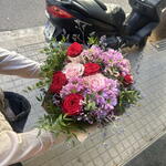 Limonium - 3 ud. crisantemo - 3 ud. rosa roja - 5 ud. rosa pastel - 3 ud. lentisco o similar - 5 ud. pétalos con nota - 1 ud.