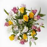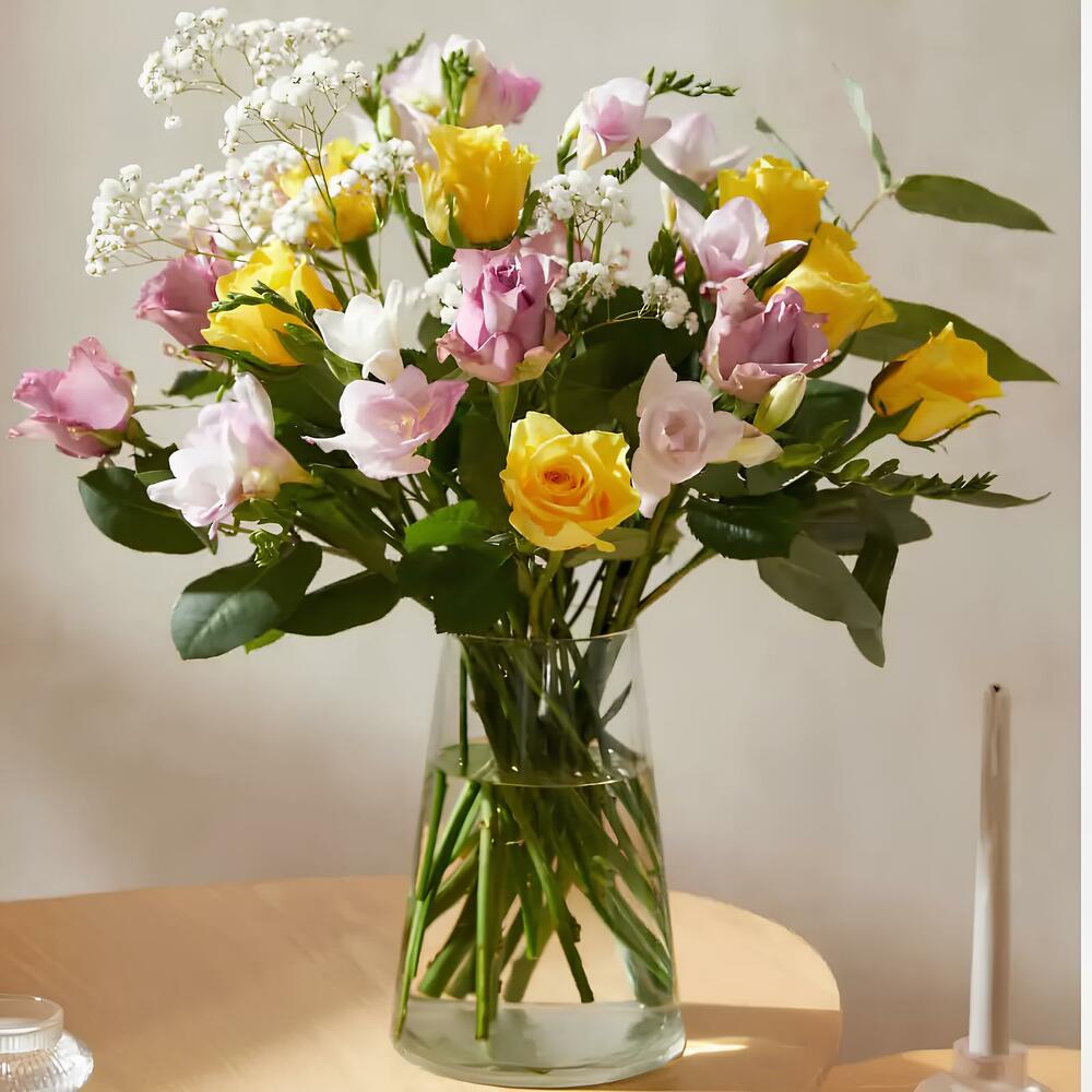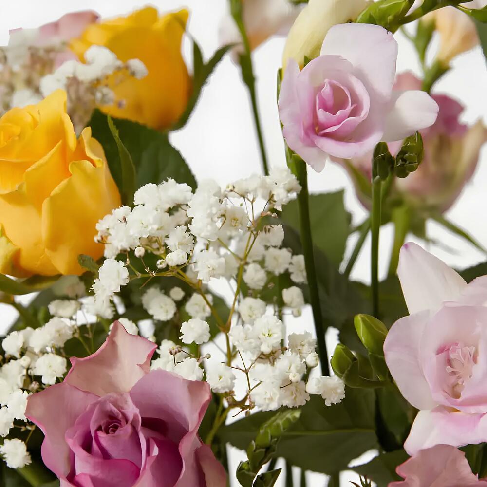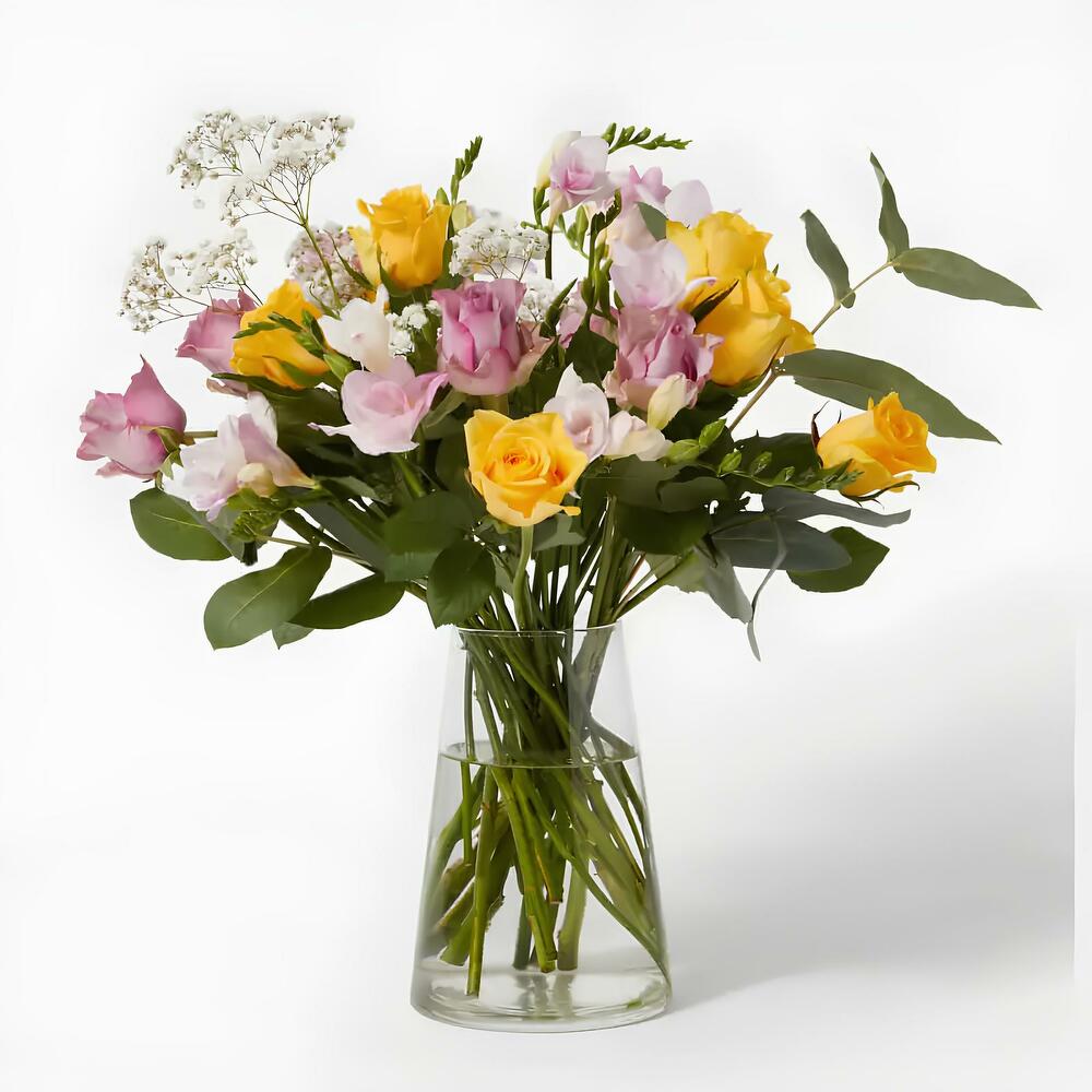 Un ramo lleno de vitalidad y encanto, ideal para alegrar cualquier momento especial. Este arreglo combina rosas amarillas vibrantes, elegantes freesias en tonos pastel y delicadas ramas de gypsophila, que le aportan un toque de ligereza y romanticismo. La frescura de las hojas de eucalipto realza la armonía del diseño, convirtiéndolo en un regalo perfecto para expresar cariño, gratitud o simplemente compartir alegría.