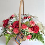 claveles - 5 ud. rosas rojas - 8 ud. cesta de mimbre - 1 ud. helechos - 5 ud. crisantemos blancos - 3 ud. espuma floral hidratante - 1 ud.