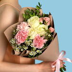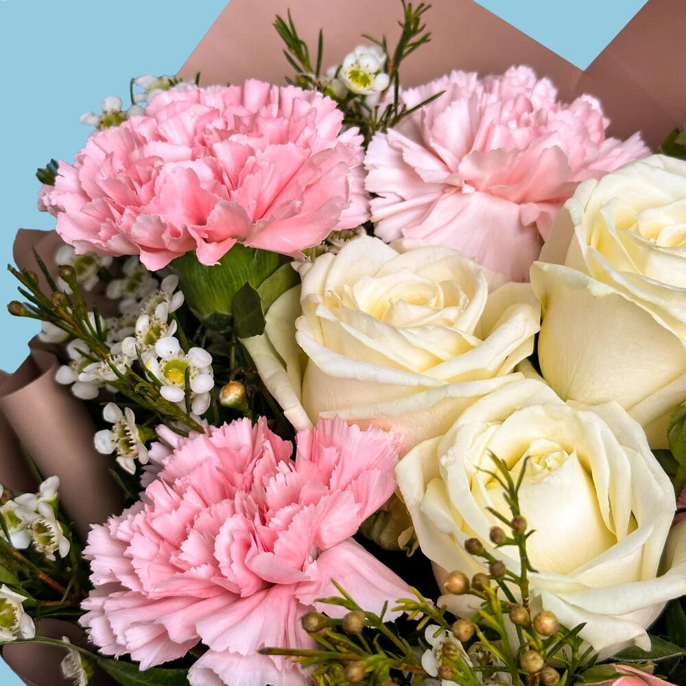 Este exclusivo ramo de autor ha sido cuidadosamente compuesto con tres nobles rosas blancas, tres delicados claveles rosas y una exuberante rosa spray. Un regalo ideal para quienes valoran el arte y la sofisticación en cada detalle.