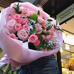 verdes variados de temporada - 4 ud. rosas spray rosadas - 7 ud. flor de acompañamiento - 3 ud. rosas premium rosadas - 5 ud.