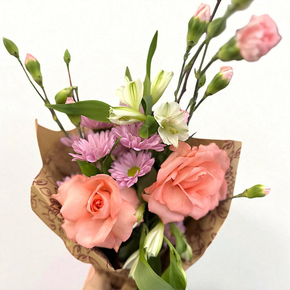 rosas - 2 ud. alstroemelia blanca - 2 ud. clavel mini pastel - 2 ud. chris’s - 1 ud.