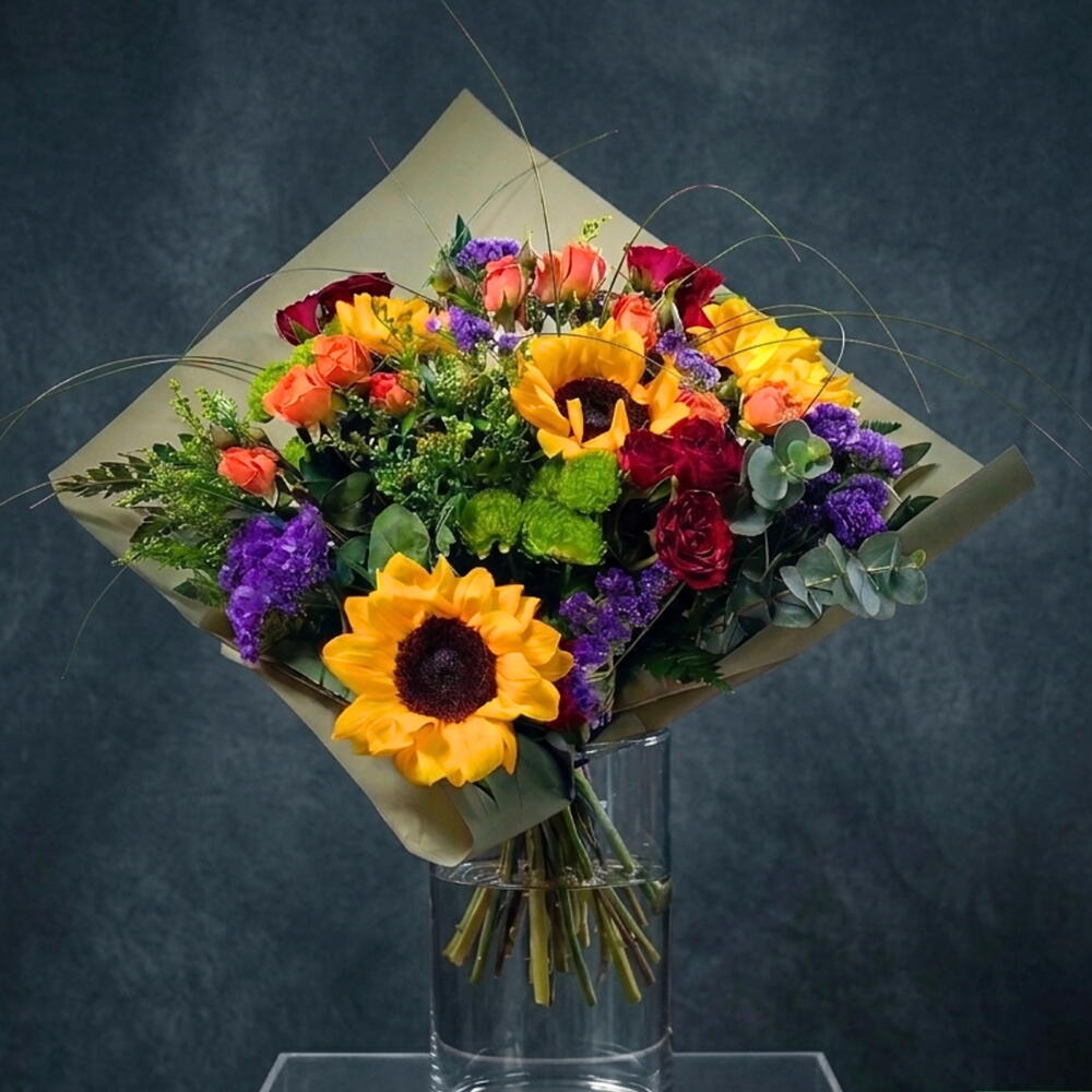 Ilumina el día de alguien especial con esta explosión de vida y color. Dos majestuosos girasoles se elevan como protagonistas, rodeados por una danza festiva de rosas naranja vibrante, profundas rosas rojas y alegres crisantemos verdes santini. Los toques de Statice morado añaden profundidad y contraste, creando una sinfonía visual perfecta. Presentado en un envoltorio artesanal, este ramo no es solo un regalo, es una dosis instantánea de felicidad y calor de hogar. Ideal para celebrar cumpleaños, logros, o simplemente para decir: Estás en mis pensamientos