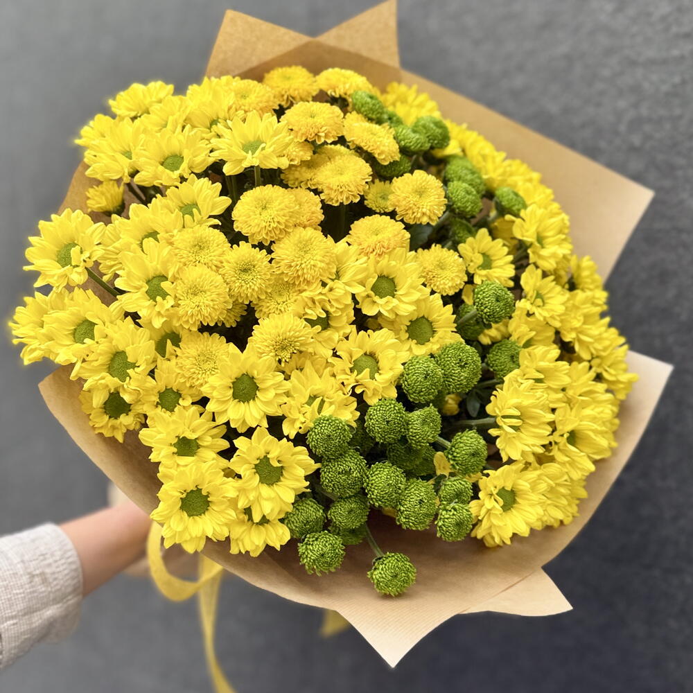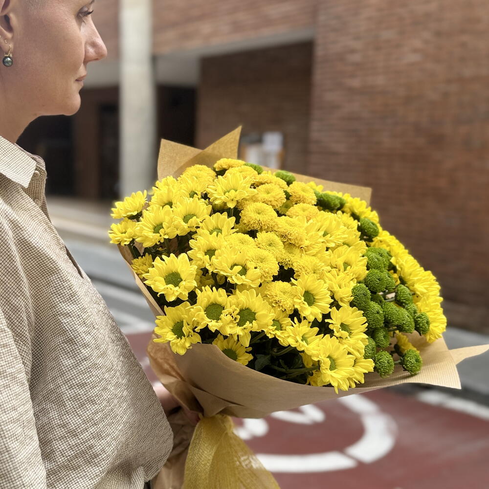 crisantemo ramificado amarillo tipo margarita - 6 ud. crisantemo ramificado amarillo tipo pompón - 2 ud. crisantemo ramificado verde pompón - 3 ud.
