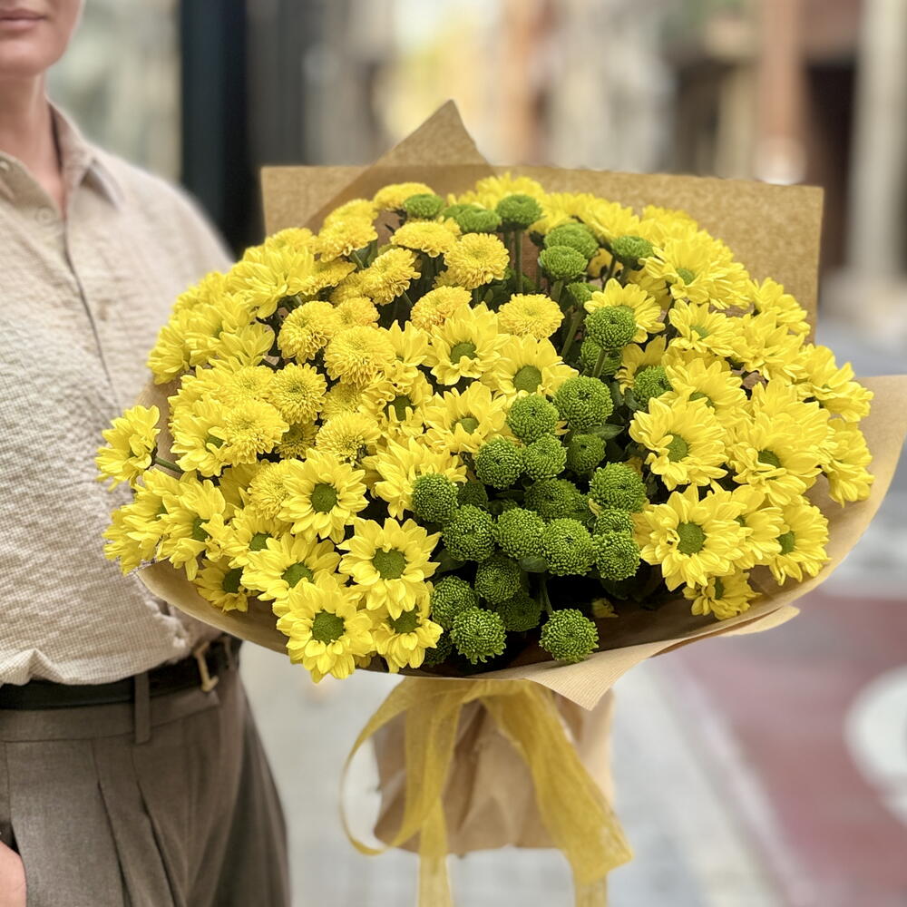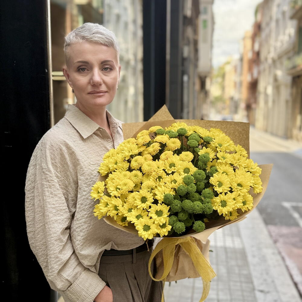 El ramo El mejor día es una explosión de alegría y positividad. Los crisantemos amarillos llenan la composición de luz y calidez, mientras que los verdes aportan frescura y contraste. Un ramo que transmite energía y convierte cualquier momento en una verdadera celebración.
